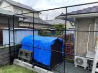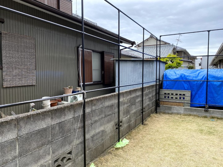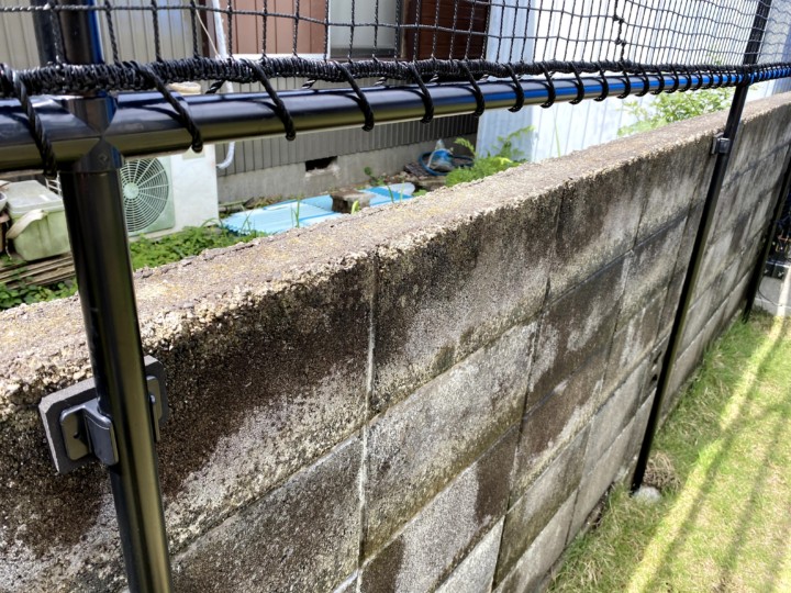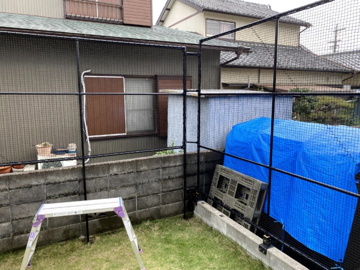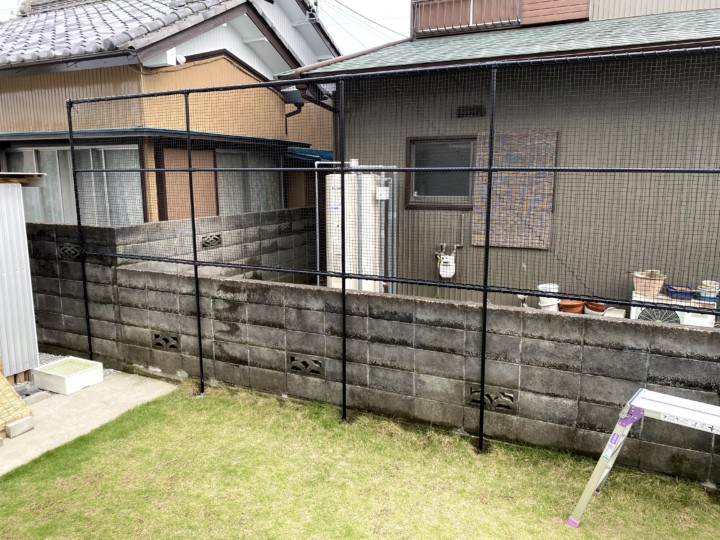 一週間後。鉄パイプに流したコンクリートもしっかり固まっていることを確認。ついに黒いネットをつける。黒いネットと黒い固定紐はネットで購入。ネットは小さく折りたたまれているので、伸ばしてから使う。