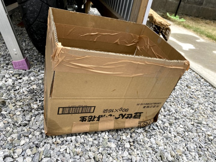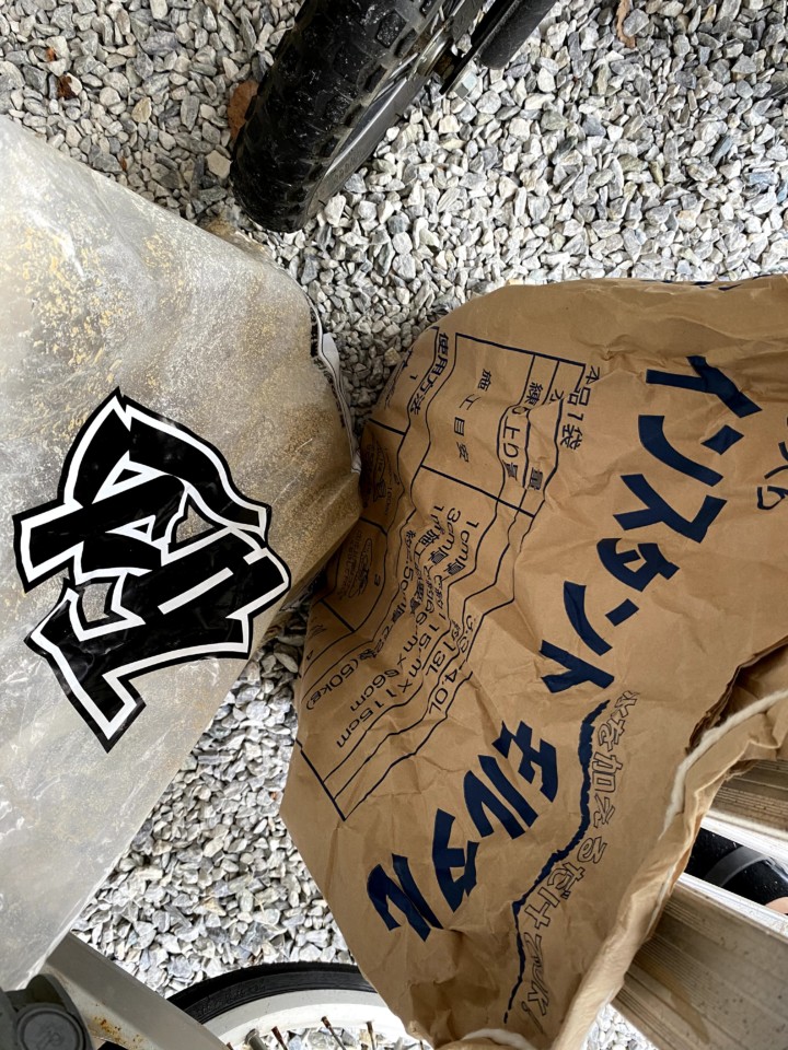 いらない段ボール箱を使い、ホームセンターでコンクリートの材料を購入。ごみ袋を段ボール箱にかぶせその中に材料を入れ、混ぜ合わせたコンクリート液を、鉄パイプの穴にそれぞれ流し込む。しっかい奥まで流れるように、折れないような強い木の棒などで押し込みながら中までしっかり入るようにする。