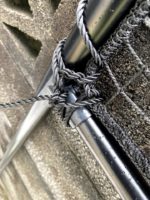 全面に仮止めしたら、ついにネットを固定用の紐で巻き付けていく。角を特にきつく巻き付ける。そして紐はネットの穴二つ分ずつくらい開けて巻き付けていく。途中でギューッと引っ張り、しっかりきつく紐が巻くよう気を付けていく。