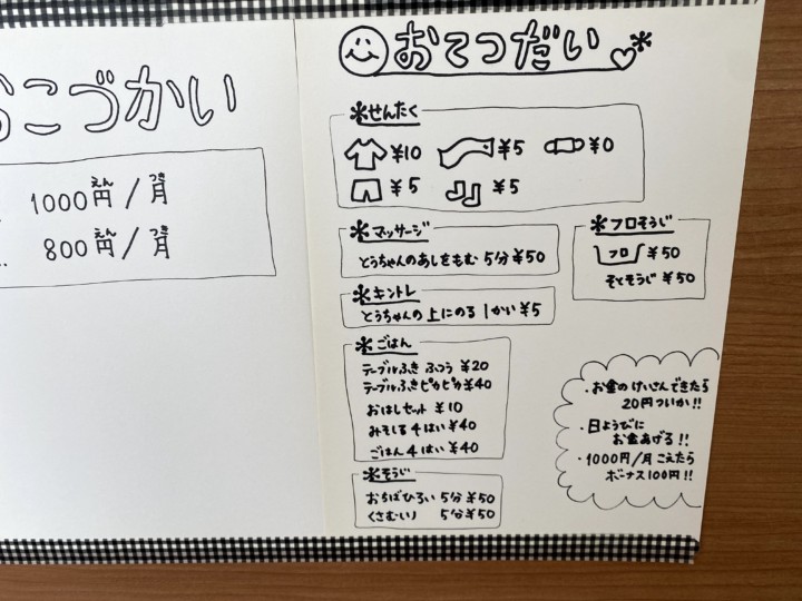 例えば洗濯たたみでは、洋服類は10円で、ズボン類は5円、タオル類は5円など。他にも料理では、お箸並べは10円、ご飯4人分よそうのは40円など。