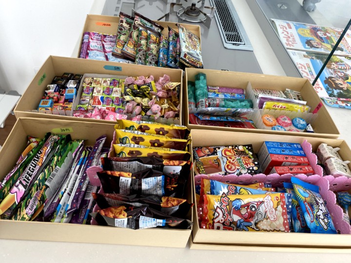 駄菓子屋さんを始める前に100均で入れ物と仕切りを購入し、お菓子のチップスでお菓子を大量に購入して、お菓子の単価を決めておく。