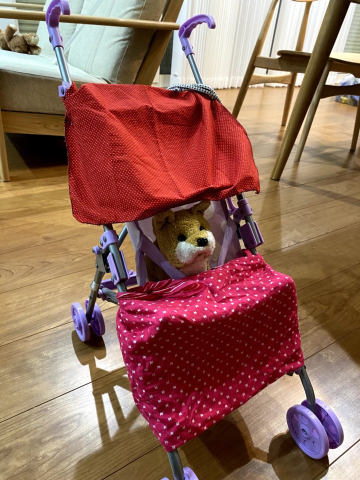 愛犬のわんちゃんもいっちょ前にベビーカーの中へ(^^)ベビーカーはなんと屋根付き!!布のしたは牛乳パックを開いたものが入っている。