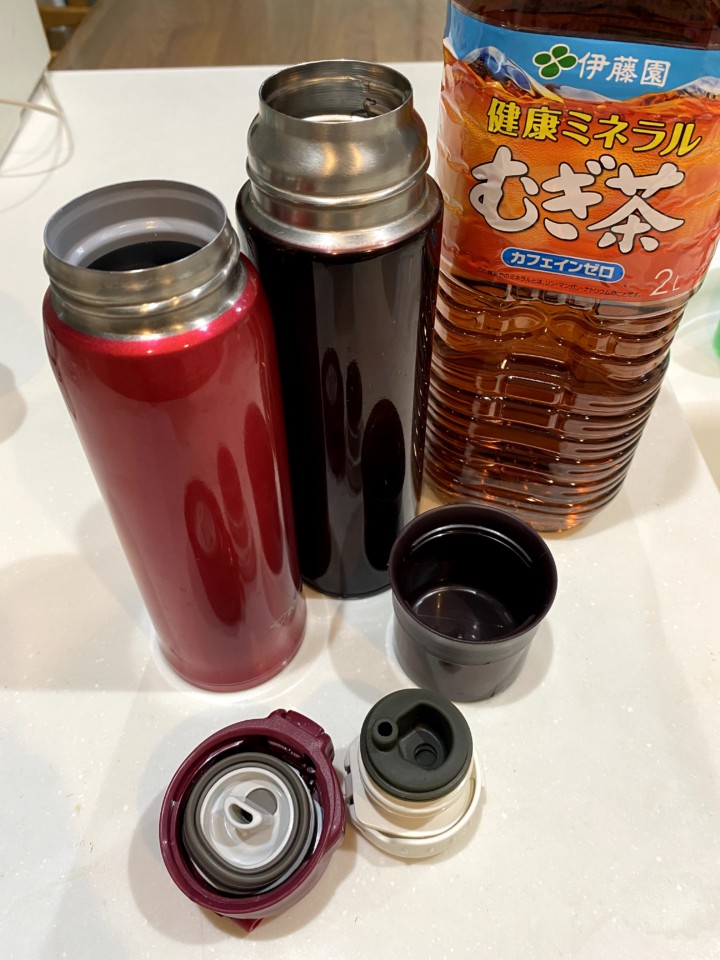 子どもたちが小学校へ持っていく水筒に麦茶を入れる。火曜は御飯も準備。