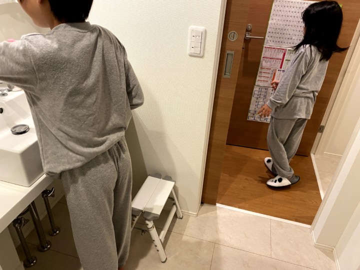 起床後は子どもたちの朝のルーティン開始。洗顔とお手洗い。