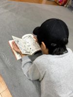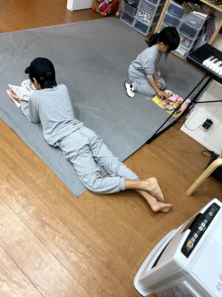 私が朝ごはんの準備をしている間、子どもたちはそれぞれゴロゴロタイム。(ドラゴンボールの漫画を読んでいることが多い、この日はたまたま娘は前日遊んだリカちゃん人形で遊んでいた)