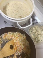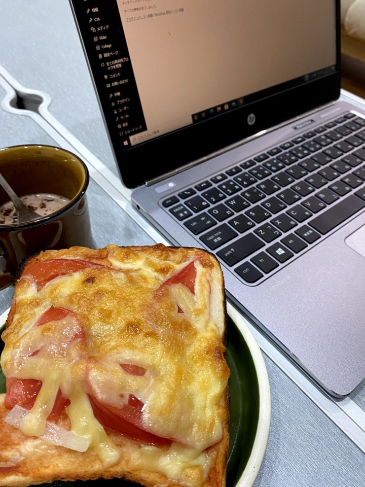 ミロin牛乳を1杯用意して、パソコンタイム。お腹がすきすぎる時はパンも。(この日はたまたま冷凍しておいたピザがあった)