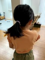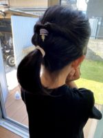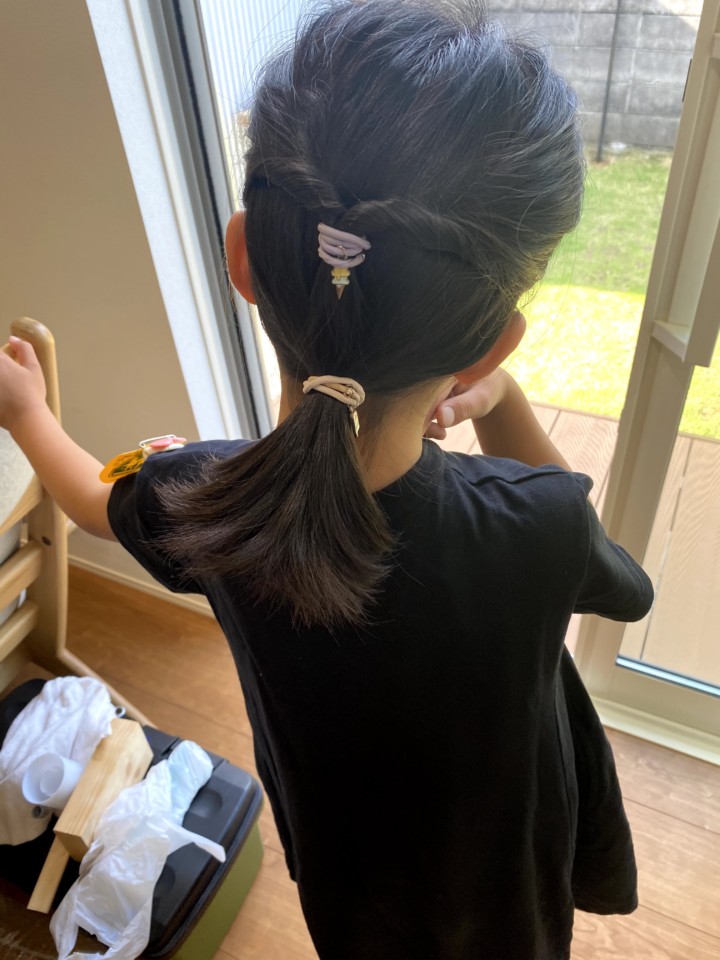 それから、発見したことは、ポニーテールの位置もポイントのようだ。下目に結ぶと必ず「ほうきヘア」になる娘の髪質。しかし、少しチを上げてみたら、束で垂れたことが分かった!!しかし、小学校への通学はヘルメット必須のため、これ以上高いポニーテールだとヘルメットが被れないのでギリギリを確認にしながら結ぶしかない。優しい髪質の子ならどの位置で結んでもヘルメットを被る時邪魔をしないはずだが、我が家の逞しい髪質の場合結ぶ高さは重要ポイントなのだ。