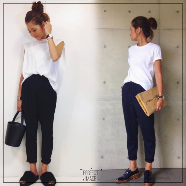 ↑白黒コーデはシンプルの中に着こなしのテクがありそうだ。半袖の袖をちょっとくるっとまくっていたり、パンツは短めで少しくるぶしが見えていたり、ヘアはアップスタイルで、靴は黒、アクセはシンプルシルバー。王道に私が大好きな格好♡現に今の職場ではこの格好!!この格好というかこのコーデを参考にさせてもらっている(^^)夏場は白Tにパンツはカーキと黒とベージュを着まわすだけ(^^)