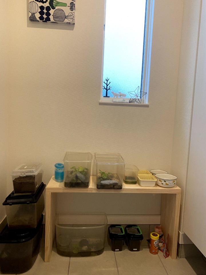 虫が大好きな子どもたち。どうしても虫かご置きが我が家には必須。ということで、夫に置き場を作ってもらい、こんな感じ。ここはしょうがない。「玄関が花」なんていうけれど、完全に我が家は「玄関は虫」だ。。。