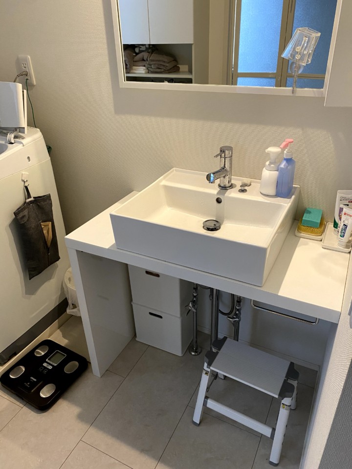 洗面の下は何も置かないと決めていたが、結局常に使う洗濯洗剤類、掃除類はニトリの引き出しのままちょこんと置いてある状態。ここにあると楽。