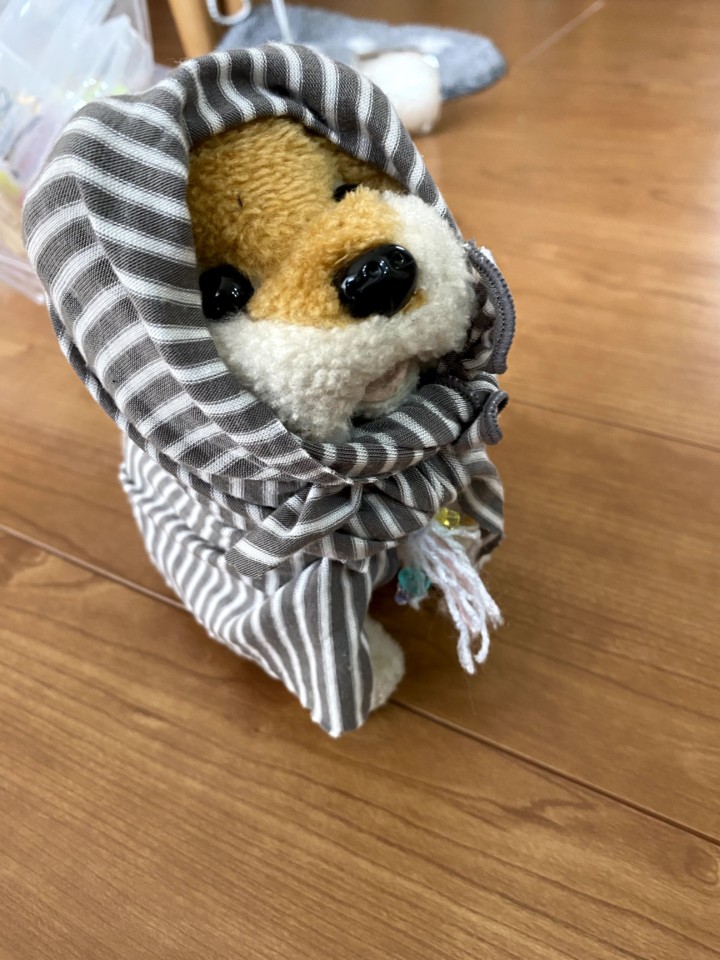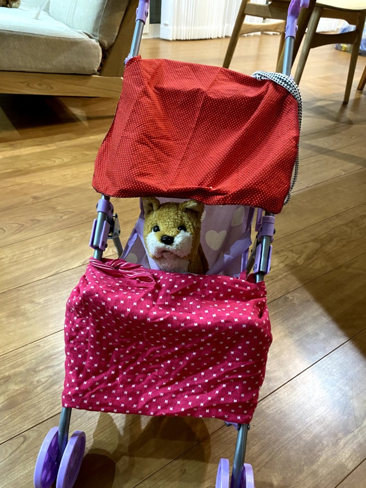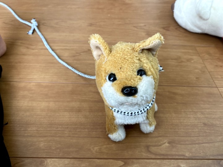トキと名付けられた人形はたまたま柴犬でとても可愛い。トキに紐をつけ部屋の中を散歩したり、折り紙で作ったうんちとそれを取るちり取りでトイレの処理をしたり、折り紙で作った餌を与えたり何だかとても楽しそうだ。