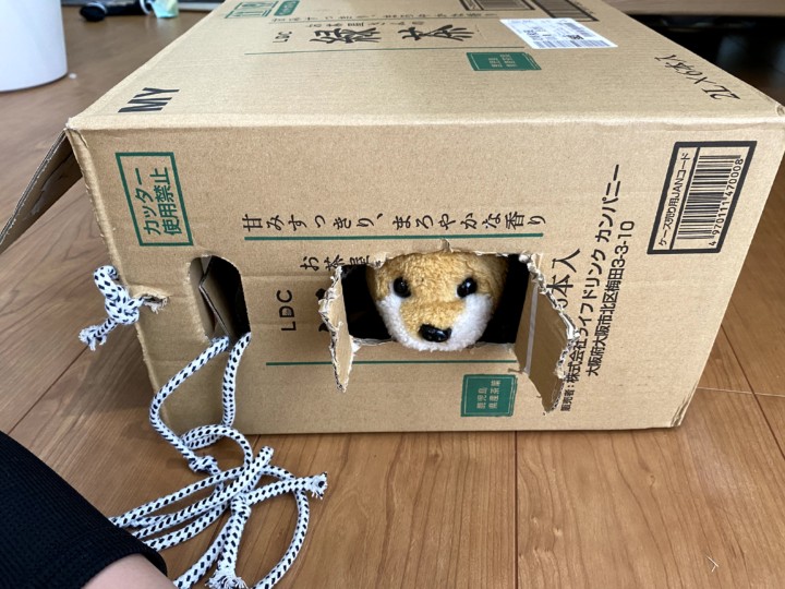 次に娘はお茶のペットボトルが入っていた段ボール箱を持ってきて、鋏でチョキチョキ切り出した。出来上がったものは犬小屋だった。鋏で切ったところは窓のようで窓からトキが顔を出していた。