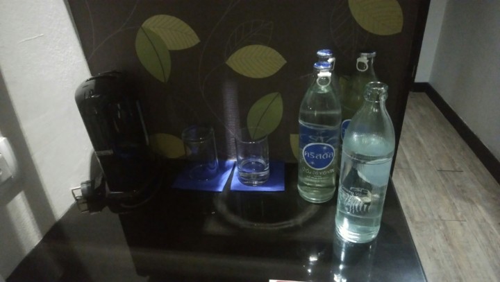 ベットの隣の冷蔵庫の棚の上には無料のお水が置いてある。このお水も毎回掃除の度に飲んだ分だけ足してくれる。ちなみにお水の上の台にお菓子も置いてあったが、こちらは食べると有料なのだそうだ。