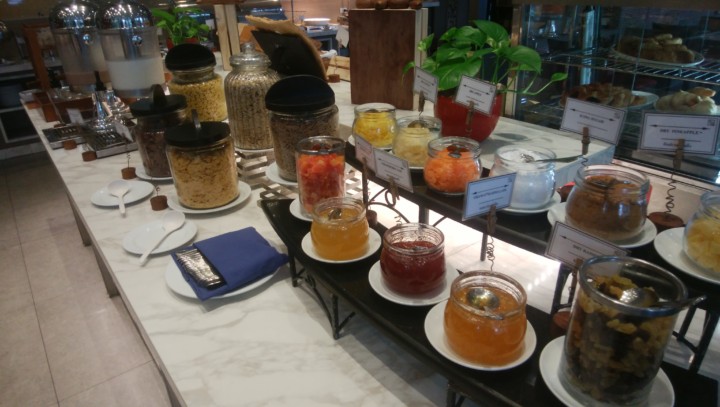 ホテルの朝食はバイキング♪パンも果物も充実!食パンを焼く機械もあって、とても美味しかった。バターやハチミツ、メイプル、イチゴジャムいろいろあった。野菜コーナーもある。