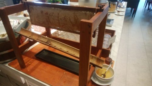 ハチミツは密が垂れるのを間近で見れる。濃厚で美味しいハチミツを味わえる。