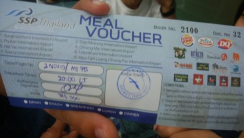 そして、窓口での対応は、飛行機が遅れてしまうということで、夕飯のクーポン券250バーツ分を一人ずつ家族4人分貰えたのだ。