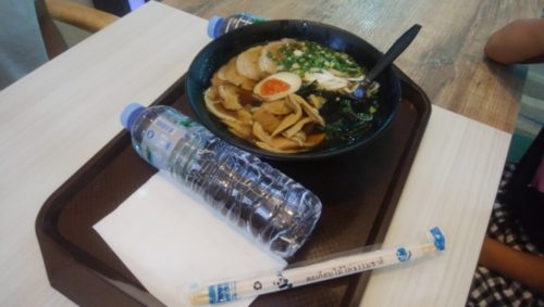 行きの飛行機で酔いまくりで嘔吐した息子のことを考え、息子が食べたいと言ったラーメン屋に行き、ラーメン2杯を家族で食べた。お水も2本買って、お腹は膨れた。