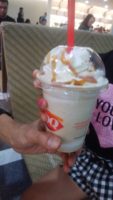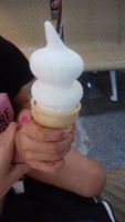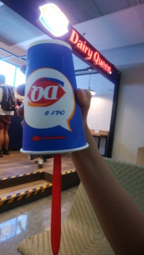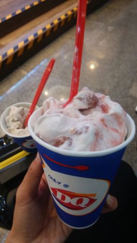そして、時間もあるし、まだクーポン券が余っていたので、デザートを食べることに。クーポン券2枚を使い、一人一つづつ食べたいなと思ったデザートを購入。DQとお店。逆さにしても落ちないアイスが有名のようだ。どの味もとっても美味しかった。