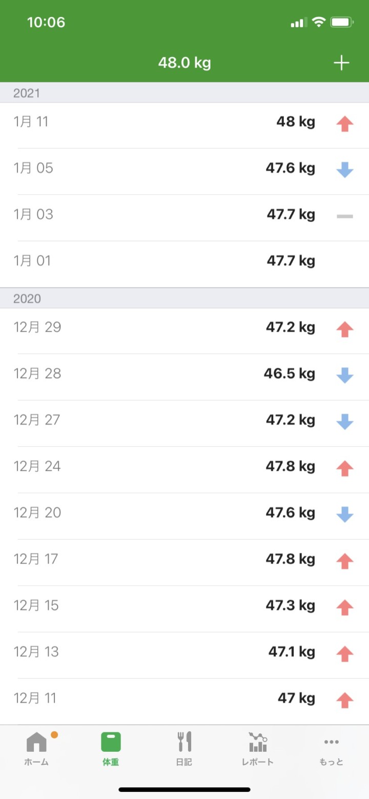 ↑このようになかなか48kgにならない。生理のときや不調なときは一気に46kgまで下がってしまうこともある。それでも目標体重目指して信じて続けた!!