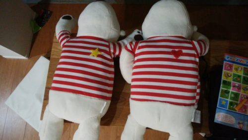 ニトリで抱き枕になるくまのぬいぐるみを子どもたちが欲しがった。お値段もお手頃だったため、買うことにした。でも全く同じぬいぐるみなので、どっちがどっちのぬいぐるみかで喧嘩をする子どもたち。これ!としっかり決まった瞬間に引き上げ、フエルトでワッペンを付けて、息子用と娘用がハッキリ区別がつくようにした!