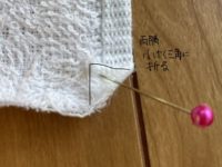 折り目でない縦生地は上から22cmのところに印をつけておく。そこから横に折り目側に向かう6cmのところに印をつけておく。