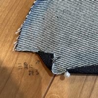 1.1枚の生地のまわりを三つ折りに折っていく。上部分はバイアステープを付けるので三つ折りにしなくてもOK。※生地が厚いので待ち針より洗濯ばさみで止めた方がやりやすい。