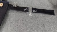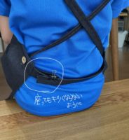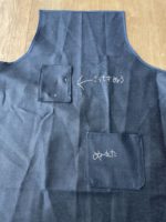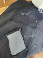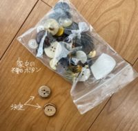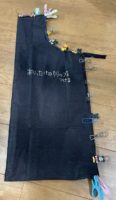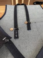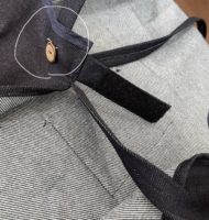 16.家中のボタンを集め、ベストなボタンを2つチョイスした。息子に試着してもらいだいたいの位置にボタンをつける。ボタンを通すところの生地を思い切って切る。なるべく小さくボタンをはめやすいギリギリの大きさに!!切った部分はほずれないように本来は縫うべきなのかもしれないが縫う技術がなく断念。でもデニム生地のため意外とほずれない(*^-^*)