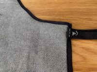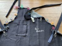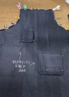 13.アイロンをかけたら半分に切る。切ったものをエプロン土台の左右にクリップで止めておく。この時バイアステープの内側に入れておく。