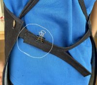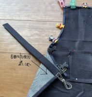 14.肩用紐も同様バイアステープの内側に入れ、クリップで止めておく。