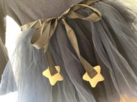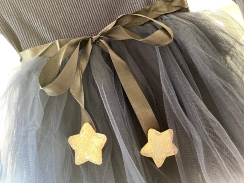 ポイントは腰の黒いリボンの先に刺しゅう屋さんで買ったラメラメ星を糸で縫い付けたところ!!もちろん星は娘と一緒に選んだ。