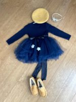 ネイビーのチュールワンピース。腰には黒いリボンがついていて、ちょうちょ結びを自分で調整する感じだ。ベレー帽とくつはカラス色にし、遠くからでも目立つようにした!!タイツは腰の黒いリボンと合わせて黒い色のラメラメにした。