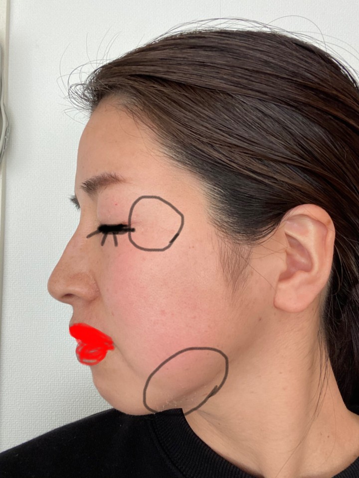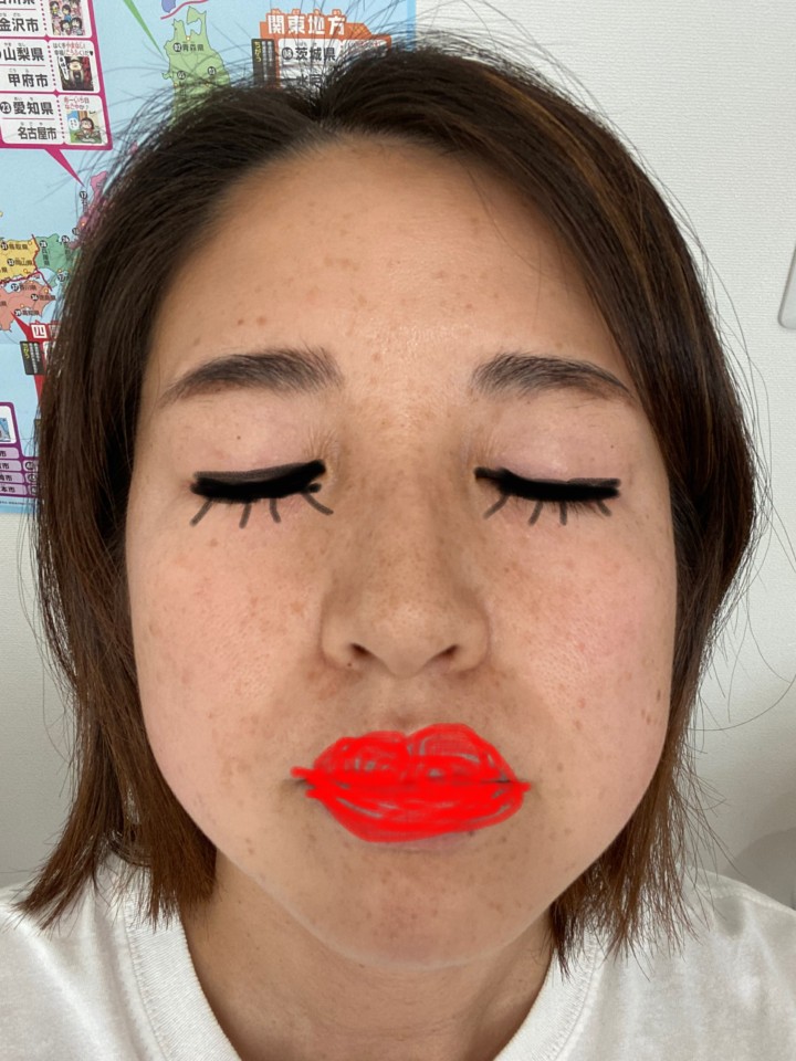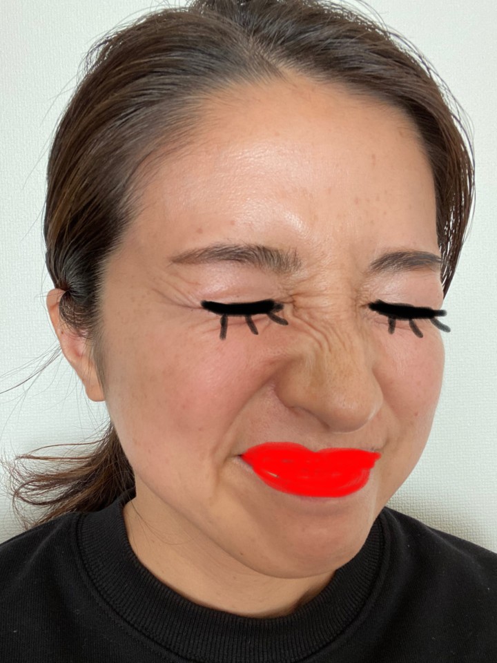 小じわやたるみが目立つ。色付きの日焼け止めしかてけていないので小さなシミたちも隠れていない状態。自黒はもともと。