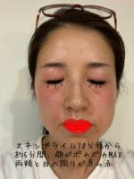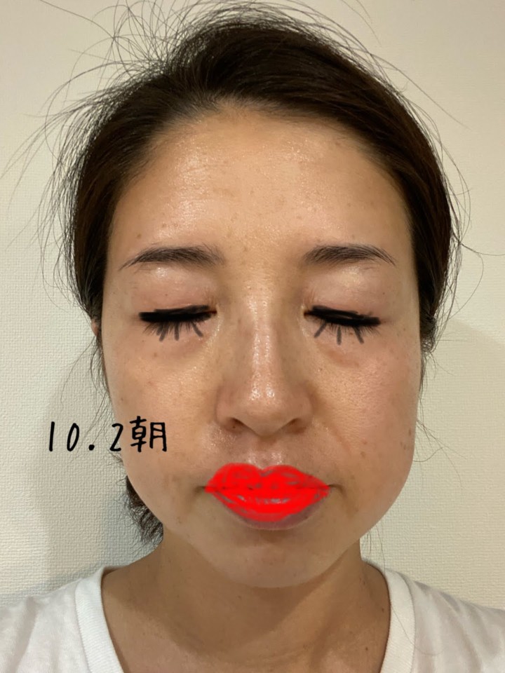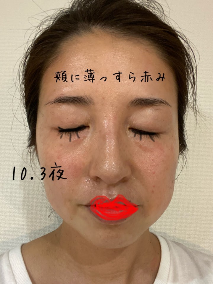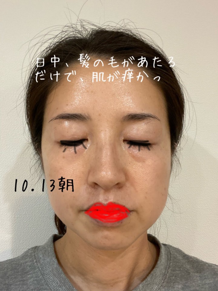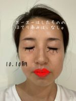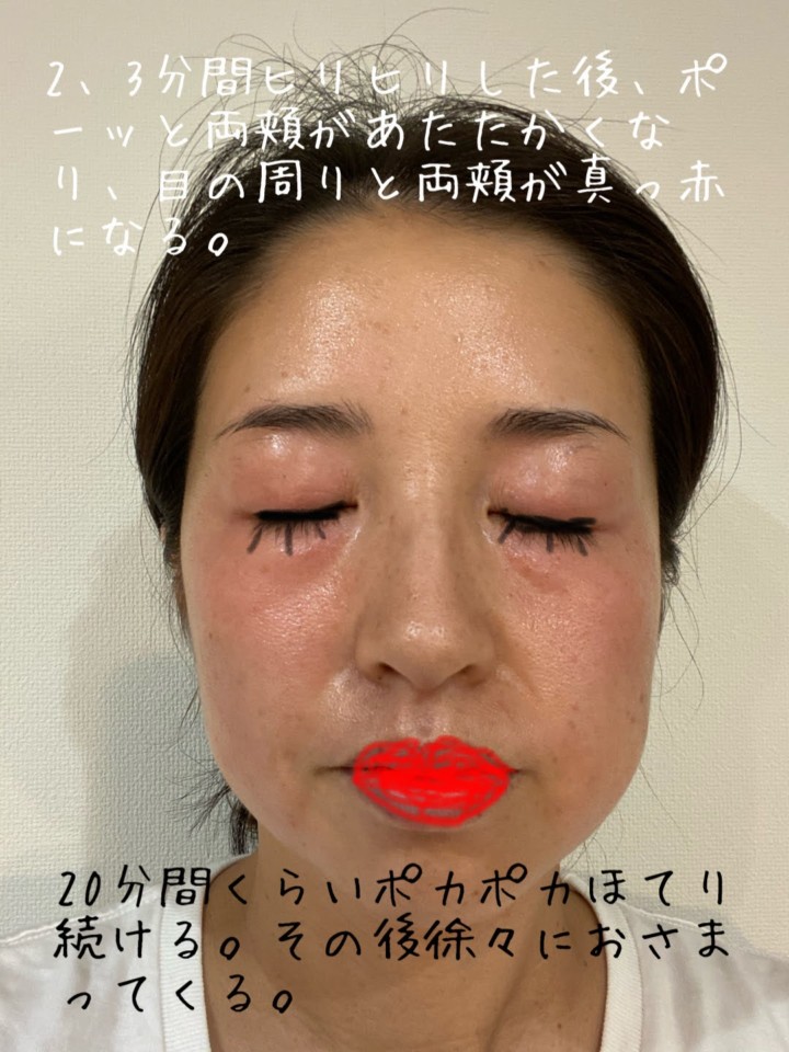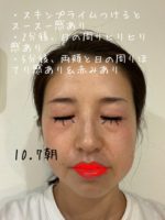 2020.10.8 昨日同様、つけた瞬間のスースーヒリヒリ感の後、顔全体がポカポカしだし、目の周りと両頬が赤くなる。この赤みは20分くらいでだんだんひく。